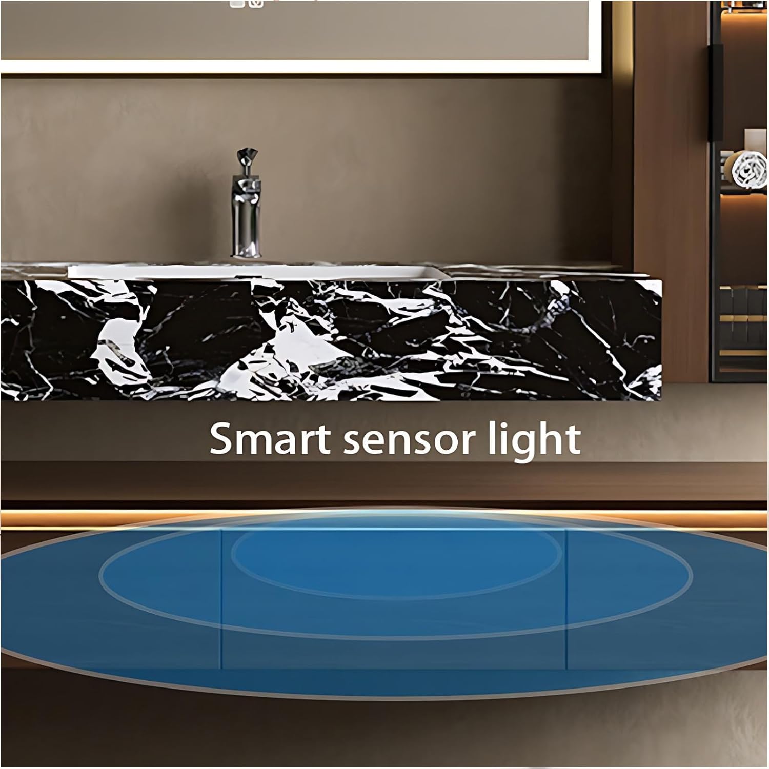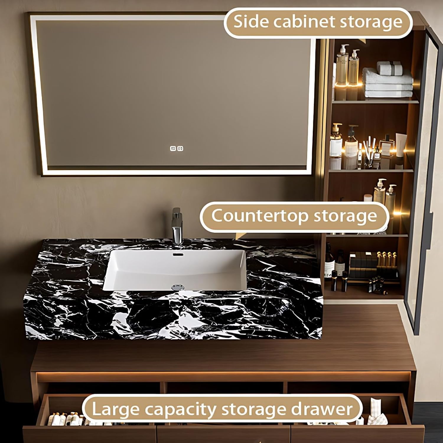 SMART LED ANTI-FOG MIRROR: The bathroom vanity set includes a touch-activated LED mirror with quick defogging tech, delivering crystal-clear reflection even in humid environments for effortless grooming.