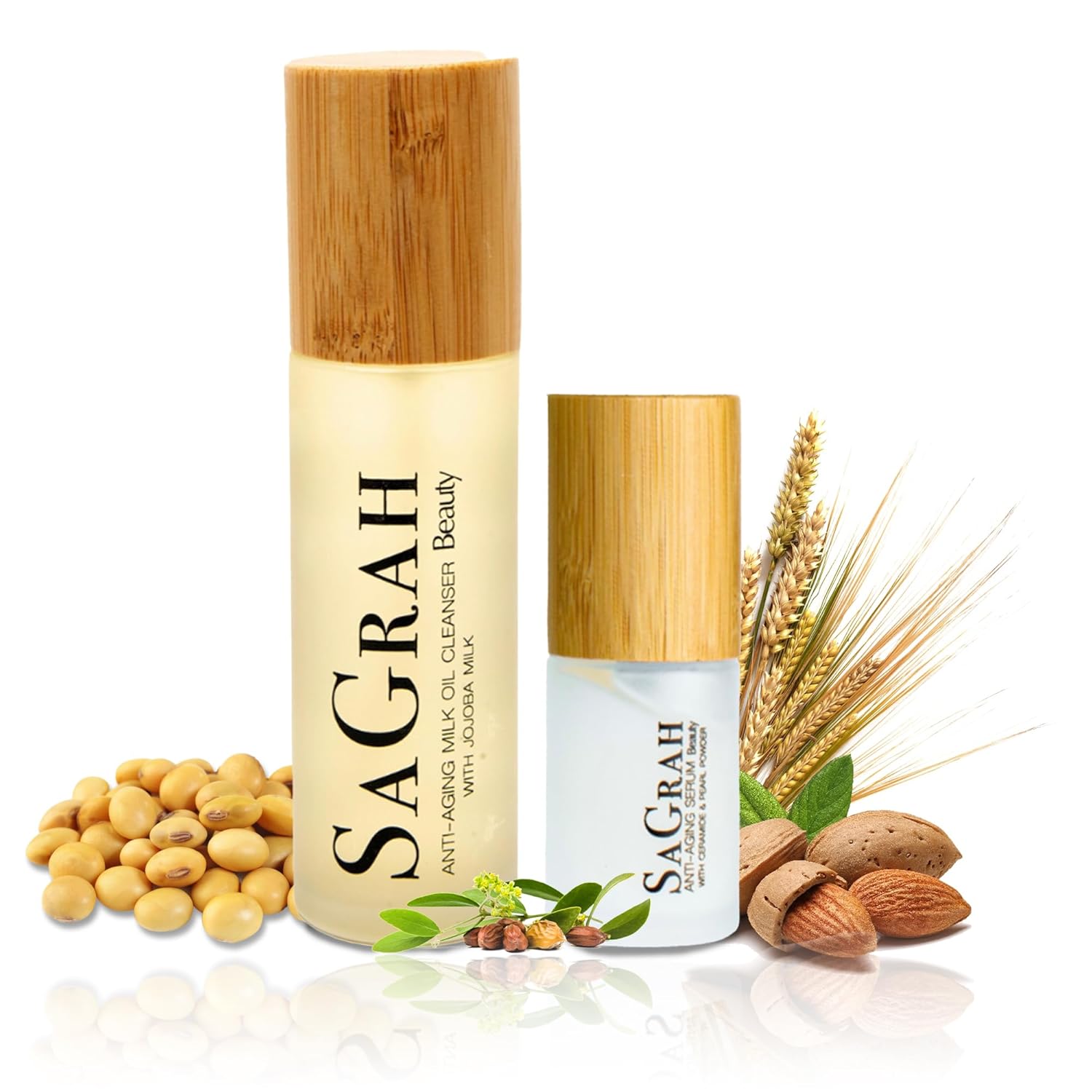 Anti-Aging Oil Cleanser with Jojoba Milk (3.4 oz) and Hydrating Face Moisturizer Ceramide Serum (1 oz) Duo for All Skin Types – 100% Vegan and Cruelty Free Skin Glow 2 Pcs Set