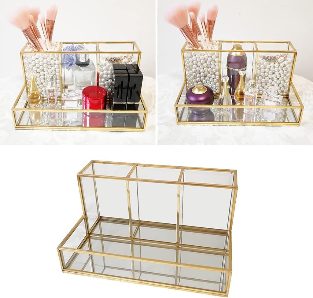 Feature: Very sleek design makeup brush holder in personally requested and designed by professional makeup artists. Takes up very little room on your vanity tabletop with 4 grids to separate your makeup brushes from your eyeliners and lip liners pencils. Organize cluttered drawers and saves space on your vanity tabletop. Made of heavy duty glass and copper e to avoid cracking and increase sturdiness. Makes your bathroom looks much better and neat. Material:Glass and Copper e Color: Clear Size: approx. 20x14x10cm/7.87×5.51×3.94inch.(LxWxH) Package includes: 1 x makeup brush holder Note: Due to the different monitor and light effect, the actual color of the item might be slightly different from the color showed on the pictures. Please allow 1-3mm measuring deviation due to manual measurement. Easy to move and comfortable.