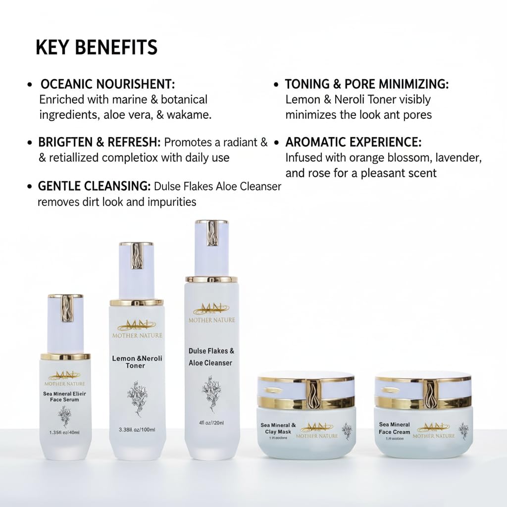 MN Mother Nature Sea Mineral 5-Piece Skincare Set – Dulse Aloe Cleanser, Lemon Neroli Toner, Elixir Serum, Clay Mask & Face Cream – Seaweed & Wakame for Renewed, Hydrated, and Brightened Skin