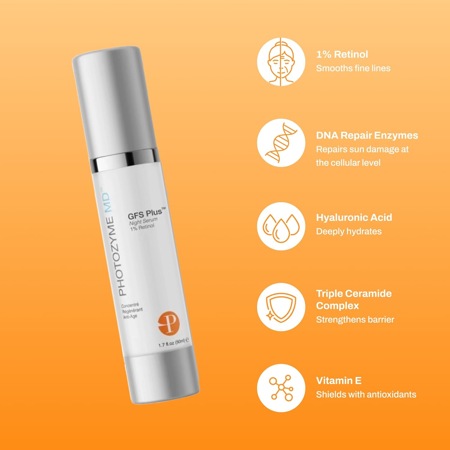 Photozyme DNA Repair Enzymes GFS Plus Facial Night Serum | 1% Retinol for Aging Skin, Beauty Skincare Treatment for Fine Lines, Wrinkles, Acne Scars | UV Dark Spot Corrector, Non Irritating | 1.7