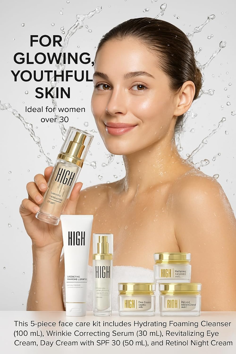 Skincare Set with Retinol & Vitamin C – 5-Step Complete Face Care Routine, Night Cream, Eye Cream, Cleanser & SPF 30 ,Anti-Aging ,by HIGH COSMETIC AGENCY